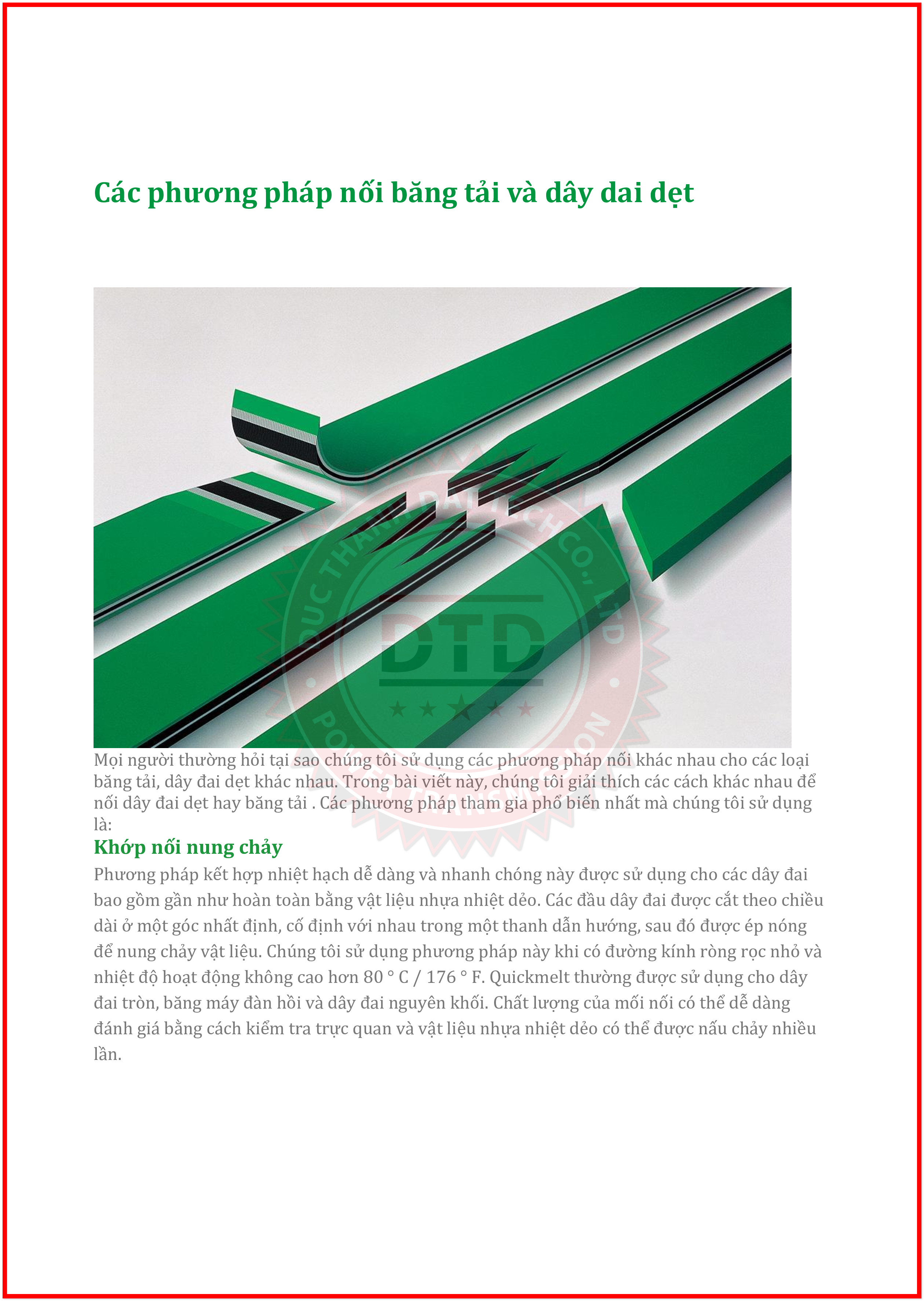 Các phương pháp nối băng tải và dây dai dẹt 17/04/2021 Các phương pháp nối băng tải và dây dai dẹt Viết bình luận: Gửi Tin liên quan Cách căng chỉnh và lắp dây curoa, dây đai dẹt Cách kéo dài tuổi thọ của dây đai dẹt, dây curoa belts Cách đo kích thước của băng tải và dây đai dẹt Câu hỏi thường gặp về dây curoa Dây curoa truyền động là gì?