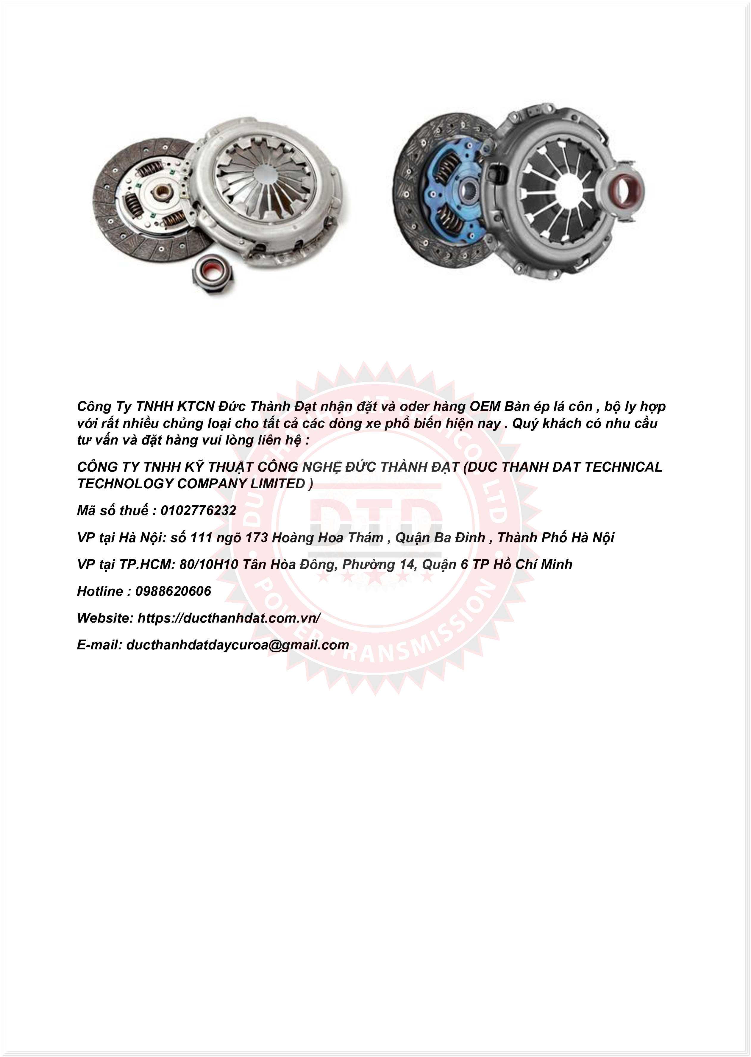 Công Ty TNHH KTCN Đức Thành Đạt nhận đặt và oder hàng OEM Bàn ép lá côn , bộ ly hợp với rất nhiều chủng loại cho tất cả các dòng xe phổ biến hiện nay . Quý khách có nhu cầu tư vấn và đặt hàng vui lòng liên hệ :